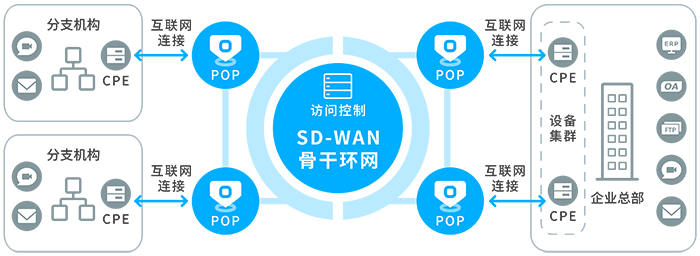 總部采用高可用集群部署方式,全球分支機構(gòu)通過互聯(lián)網(wǎng)接入SD-WAN平臺,針對視頻會議、OA、ERP、FTP和Email等應(yīng)用場景定制優(yōu)化策略,為客戶實現(xiàn)集中管理、網(wǎng)絡(luò)加速、成本優(yōu)化等多方面收益。